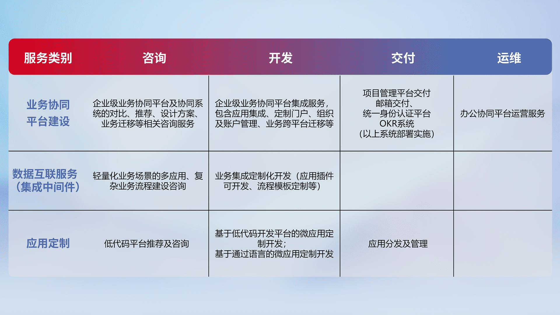 针对钉钉、、、企微、、、、IDaas等平台级产品提供产品的规划、、、、方案、、、、交付、、定制化开发等服务,,,实现如统一协同办公、、、、智能客户服务、、、混合会议管理、、智能数据查询、、、等业务场景,,,实现数字化转型。。